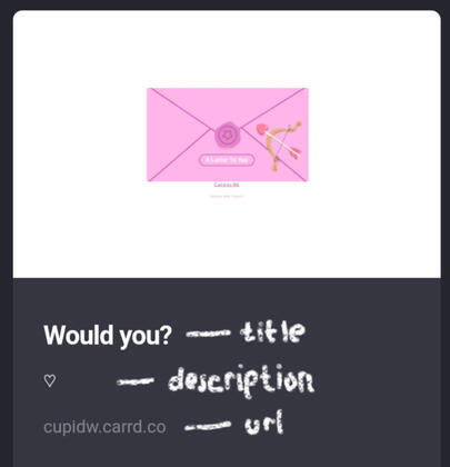 TITLE carrd bakal keliatan di bagian paling atas website waktu dibuka dan di preview thumbnail waktu link carrd dikirim. DESCRIPTION keliatan di beberapa platform aja, seperti telegram, dan ini wajib diisi ya, kalau dikosongin bakal aku tulis (-).
